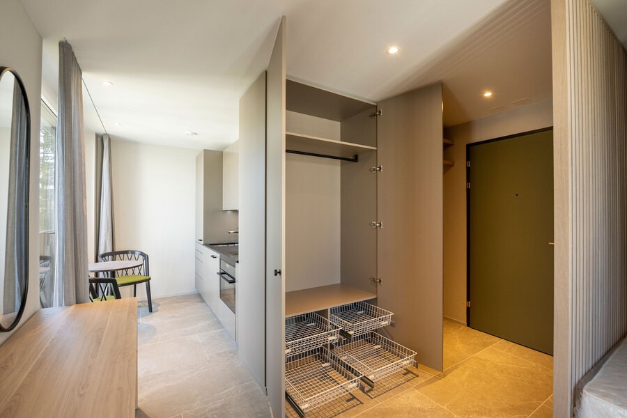 Ja, in jedem Studio finden Sie alles, was Sie zum Wohnen brauchen: Bad mit Dusche, WM/Tumbler und Lavabo; ein 160er-Bett inklusive Matratze mit integrierter Schublade für zusätzlichen Stauraum und Lamellen-Trennelement für Privacy, ein Lounge-Bereich mit Sessel, Sitzbank und Tisch; ein Esstisch mit Stühlen; eine Forster Metallküche mit Kochfeld sowie Backofen/Mikrowelle; Einbauschrank und Regale.